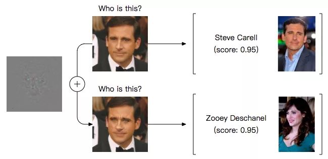 许多研究已经证实,深层神经网络容易受对抗样本影响。通过在图像中加入一些细微扰动,分类模型会突然脸盲,开始指猫为狗、指男为女。如下图所示,这是一个美国演员人脸分类器,输入一张正常的Steve Carell图像后,模型认为照片是他本人的概率有0.95。但当我们往他脸上稍微加了点料,他在模型眼里就成了女演员Zooey Deschanel。