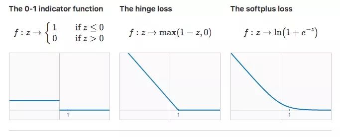 通常情况下,我们训练线性分类器时会用合适的损失函数f找到权重向量w和偏置项b,使R(w,b)最小。在一般二元分类问题中,下面是三个值得关注的损失函数: