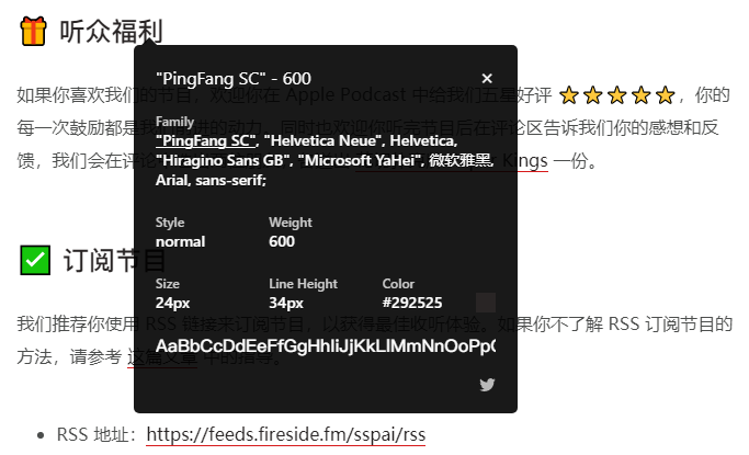 将鼠标靠近想要识别的字体以后,就能看到对应的字体名称了,此时点击左键还能展开详细信息,比如当前网页所使用的字体集,以及当前字体的大小、颜色等信息。