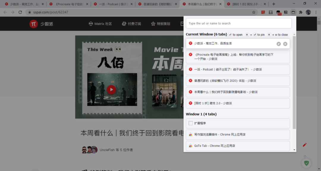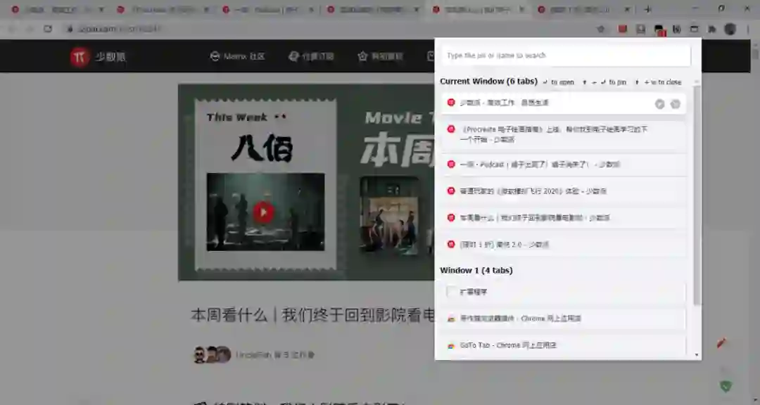相比于传统的 Ctrl / Control + Tab,GoTo Tab 的优势在于通过小窗口来切换标签。小窗口的好处在于,即使打开了海量页面,也可以直接预览它们的标题,从而实现精准定位。