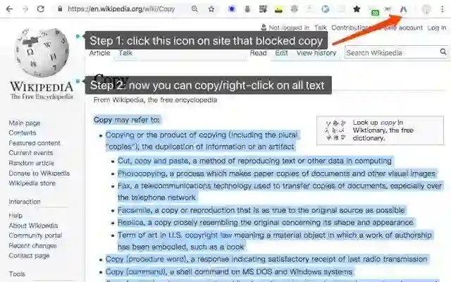 在初次进入需要解锁复制权限的网站时,你需要先点击 Simple Allow Copy 的图标进入复制模式。Simple Allow Copy 会自动记住哪些网站需要解锁限制,下次访问的时候就不需要重新点击图标了。解锁复制权限有可能导致一些网站无法正常显示,此时只需要点击 Simple Allow Copy 图标将其禁用即可。