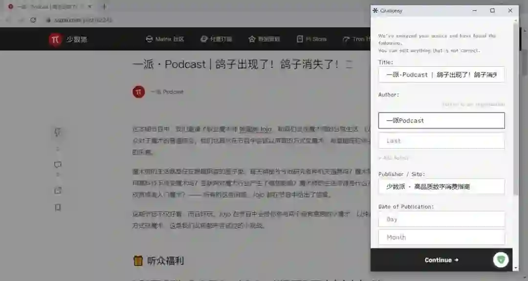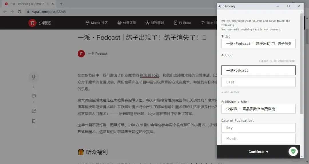 在收藏时,Citationsy 会自动为你分析文章标题、作者等信息,你也可以在确认页面为其手动添加发表时间一类的详细内容。相比于同类扩展,Citationsy 的操作流程更加简便,在后续回顾时,你也可以通过不同项目、标签来进行筛选。