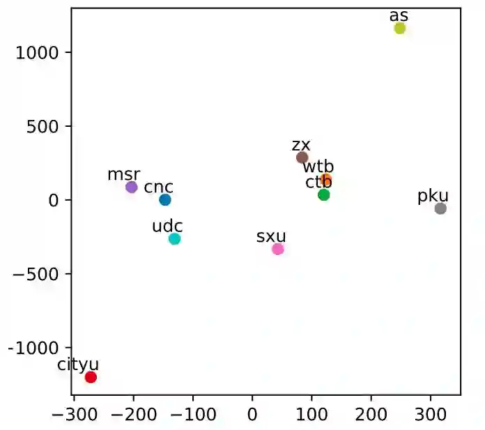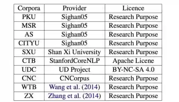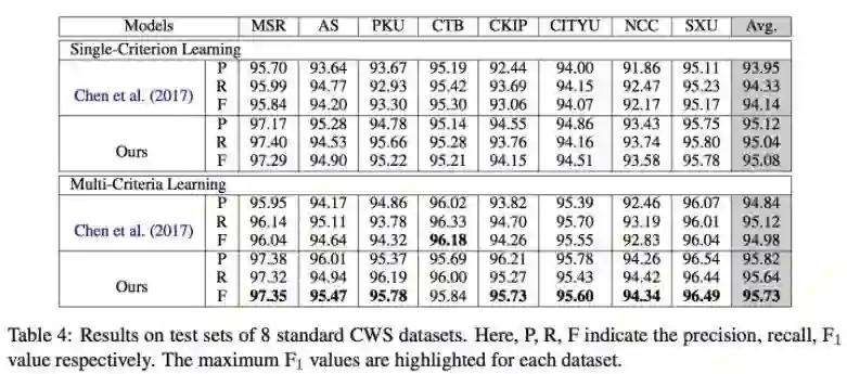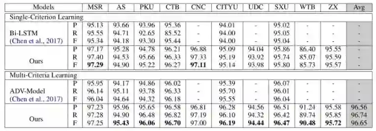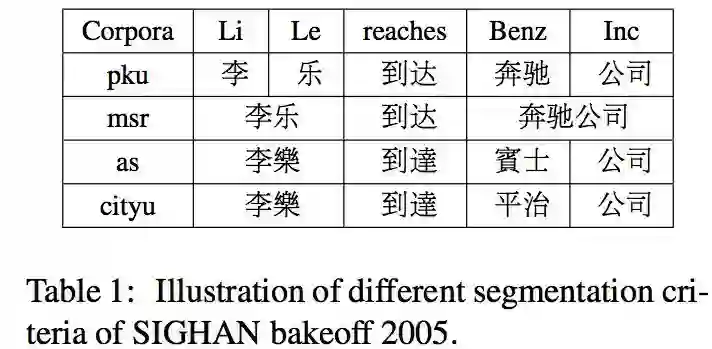 已经有工作开始研究如何利用多方语料库来联合学习中文分词,比如 Chen 20171精心设计的对抗神经网络,针对每个语料库提取分词标准相关或无关的特征。然而该工作并没有达到前沿的准确率,甚至联合训练的成绩还比不上以前单独训练的分数,无法体现联合学习的本意与优势。