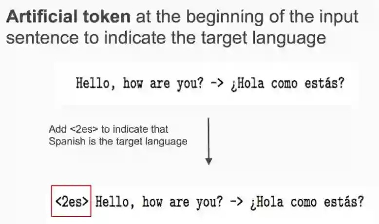 谷歌的解决方案说来简单,却不失优雅。聪明之处在于不修改网络架构,而是在输入数据上做手脚。只需在输入平行语料pair中人工加入目标语种的标识符,就可以把所有语种的平行语料混合在一起训练了: