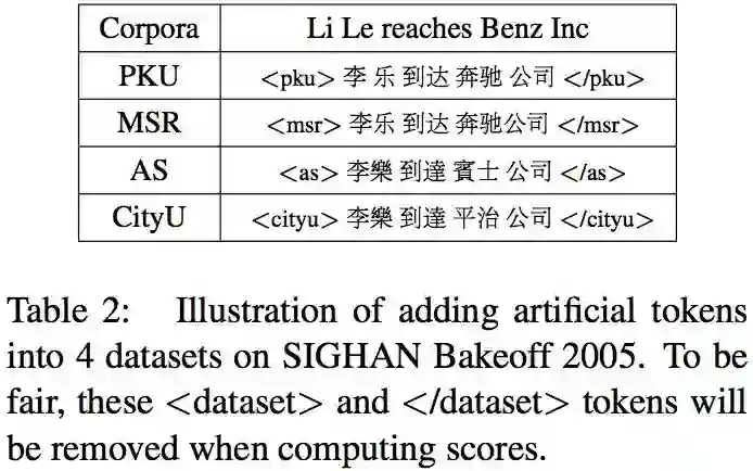 受谷歌的多语种翻译系统启发,我们发现只需在句子首尾添加一对标识符,即可平滑无缝地将多标准语料库混合起来训练。具体做法是用一对闭合的<dataset> </dataset>将每个句子包裹起来: