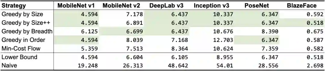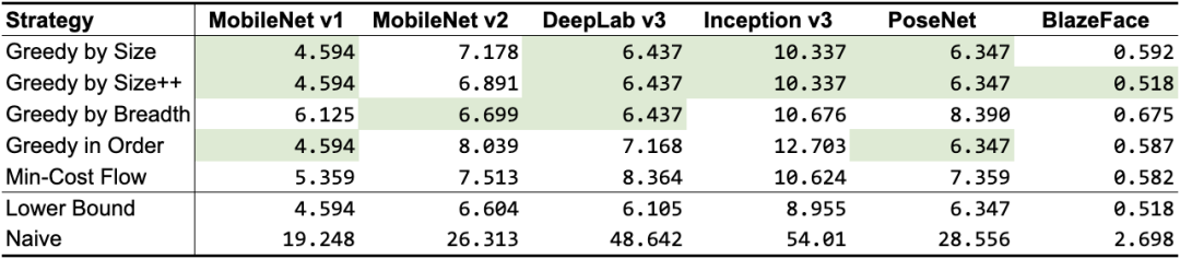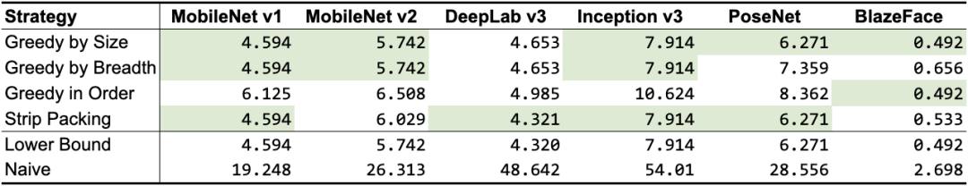 表 1. “共享对象”策略的内存占用量(以 MB 为单位;最佳结果以绿色突出显示)。前 5 行是我们的策略,后 2 行用作基准(“下限”表示最佳数的近似值,该值可能无法实现,而“朴素”表示为每个中间张量分配专属内存缓冲区的情况下可能的最差数)