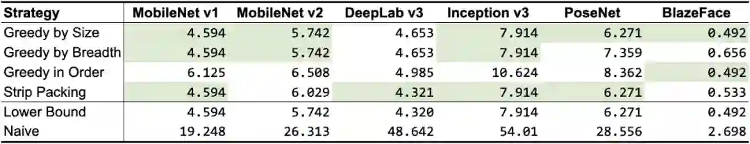 表 2. “偏移量计算”策略的内存占用量(以 MB 为单位;最佳结果以绿色突出显示)。前 3 行是我们的策略,接下来 1 行是先前的研究,后 2 行用作基准(“下限”表示最佳数的近似值,该值可能无法实现,而“朴素”表示为每个中间张量分配专属内存缓冲区的情况下可能的最差数)