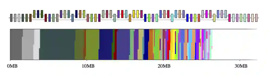 图 1. MobileNet v2 的中间张量(上图)及其到二维内存空间大小的映射(下图)。如果每个中间张量分别使用一个专用的内存缓冲区(用 65 种不同的颜色表示),它们将占用约 26MB 的运行时内存