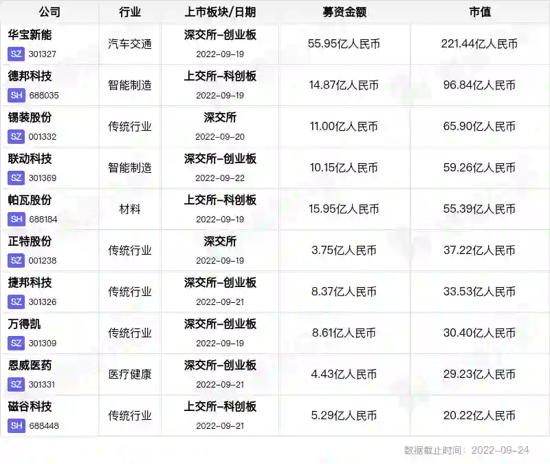 本周重点监测到国内IPO公司共10家。分别于深交所主板、科创板和创业板上市,最新市值最高为