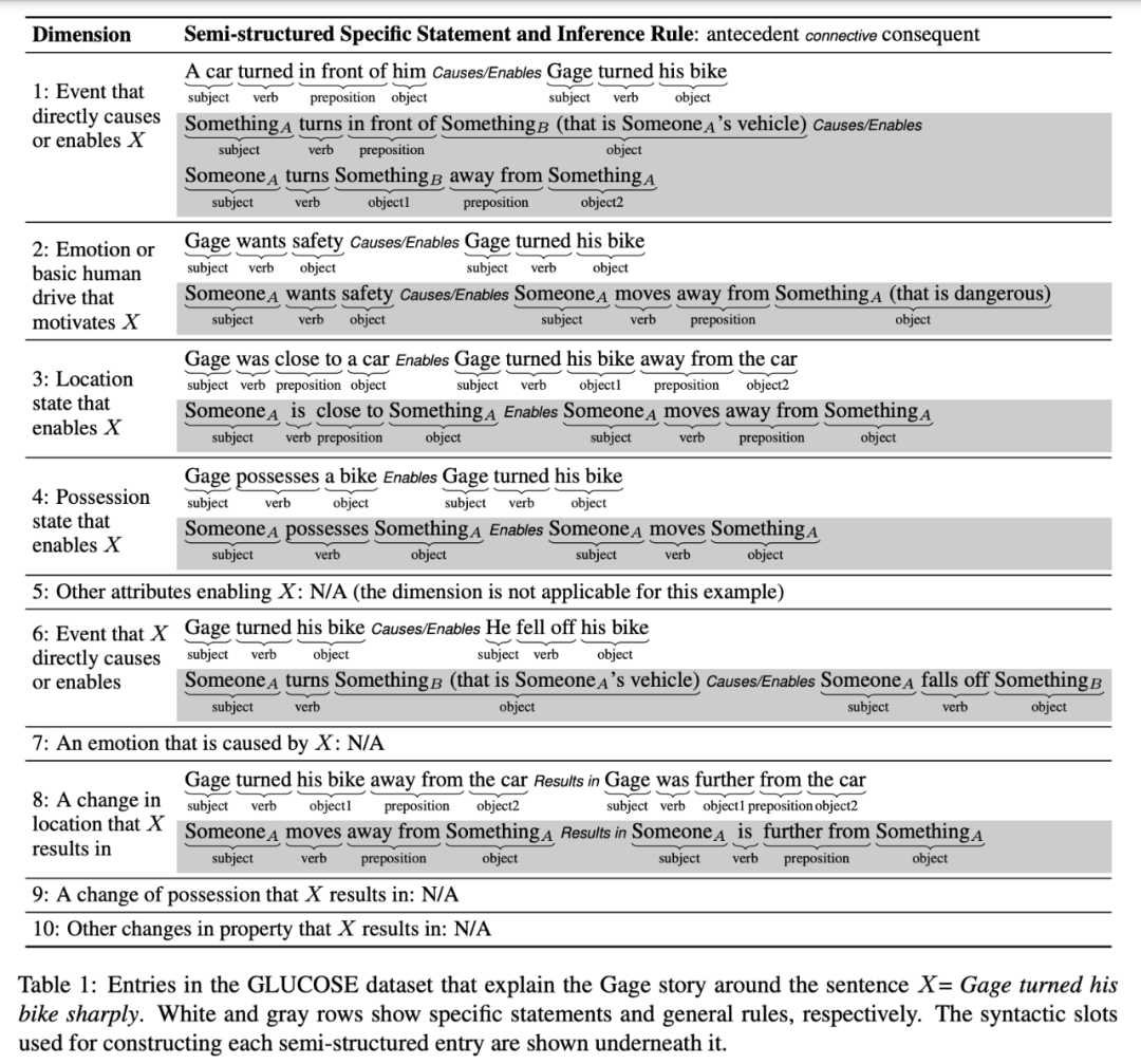 ▲ Entries in the GLUCOSE dataset that explain the Gage story around the sentence X= Gage turned his bike sharply.