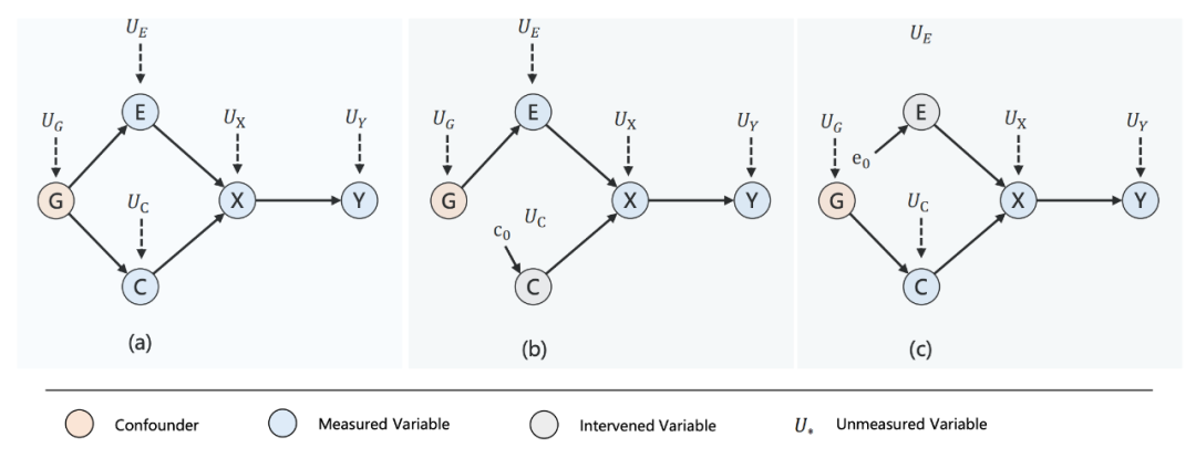 作者为 NER 模型的推理机制构建了相应的 SCM 并以 DAG 的形式可视化,其中结点 G 表示混杂因子——既影响了实体结点 E的同时也影响了上下文结点 C,结点 X 则代表了由结点 E 和 C 所生成的输入实例,结点 Y 是 NER 模型的评估指标,如 F1 值。