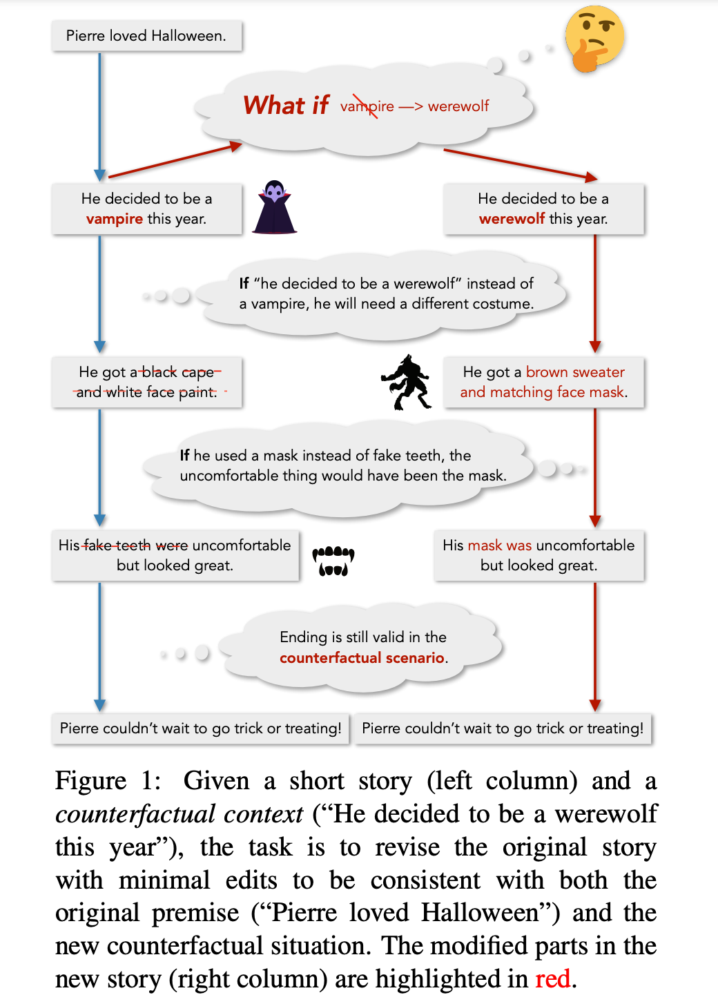 举个例子,如下图所示,左侧提供了原始故事版本,Pierre 喜欢万圣节,想要在万圣节扮演吸血鬼,因此他准备了相应的打扮,但假设 Pierre 想要扮演的是狼人,通过反事实推理,我们知道接下里的故事内容要于狼人相符。