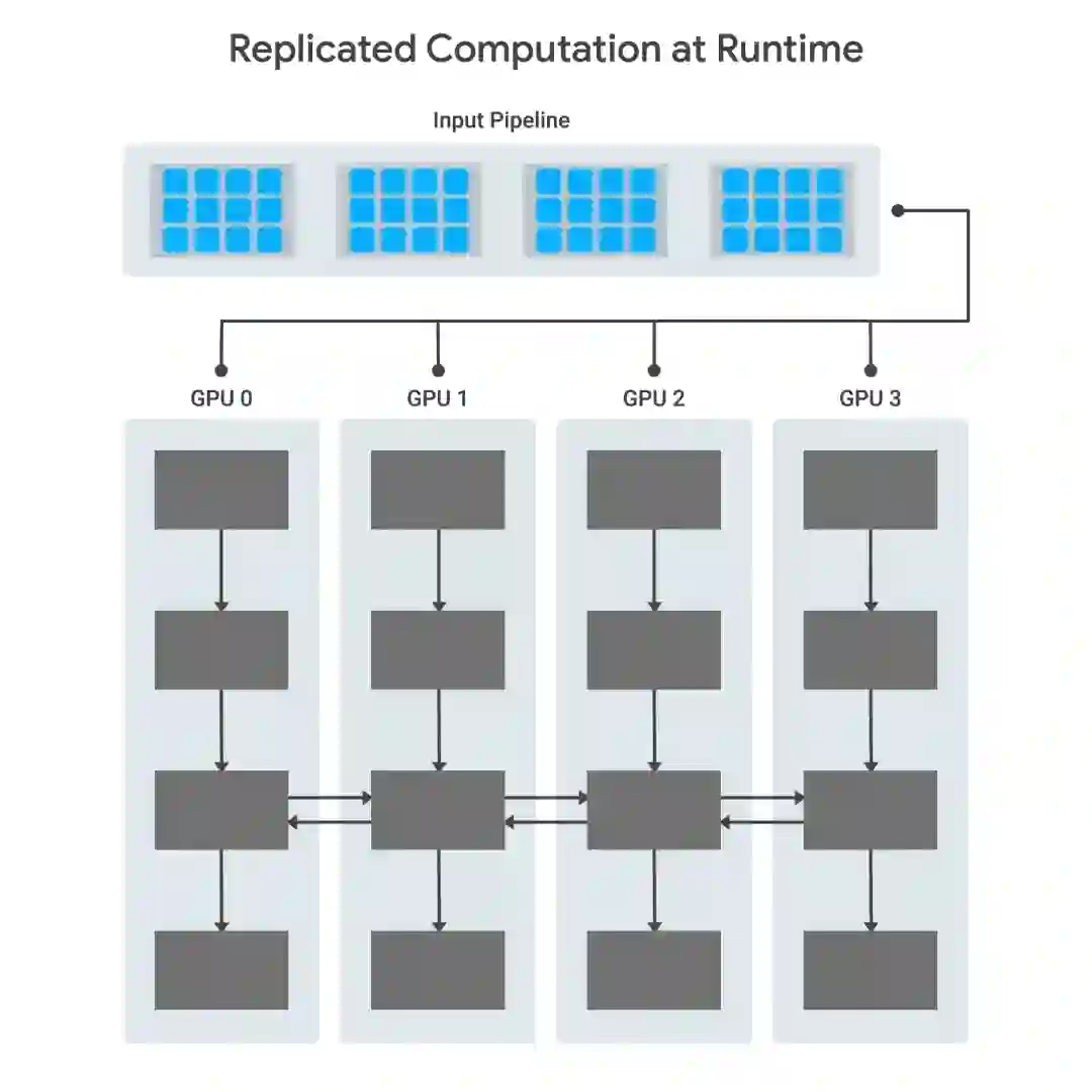 输入数据从主机发送到各个 GPU, GPU 立即开始处理。当需要在 GPU 之间交换信息时,它们会在发送数据之前进行同步。