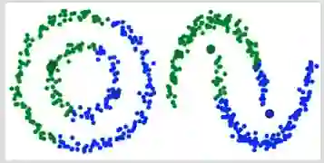 K-Means算法的主要缺点之一是它直接用了距离质心的平均值。我们可以从下图中看出这样做为什么不好——图的左侧是两个半径不同的同心圆,K-Means没法处理这个问题,因为这些聚类的平均值非常接近;图的右侧是一个中心对称的非圆形分布,K-Means同样解决不了它,因为如果单纯依靠均值判断,算法无法捕捉更多特征。