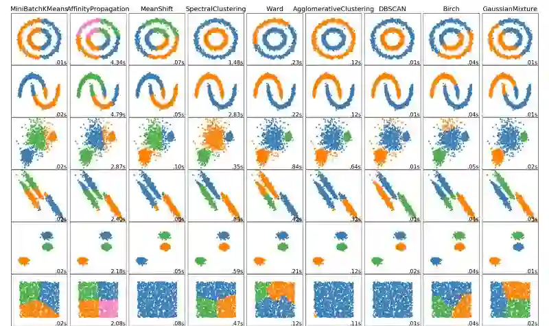 以上就是数据科学家需要知道的5个聚类方法。在文章的最后,就让我们以一幅聚类图做结,直观展示这些算法和其他算法的完美表现!