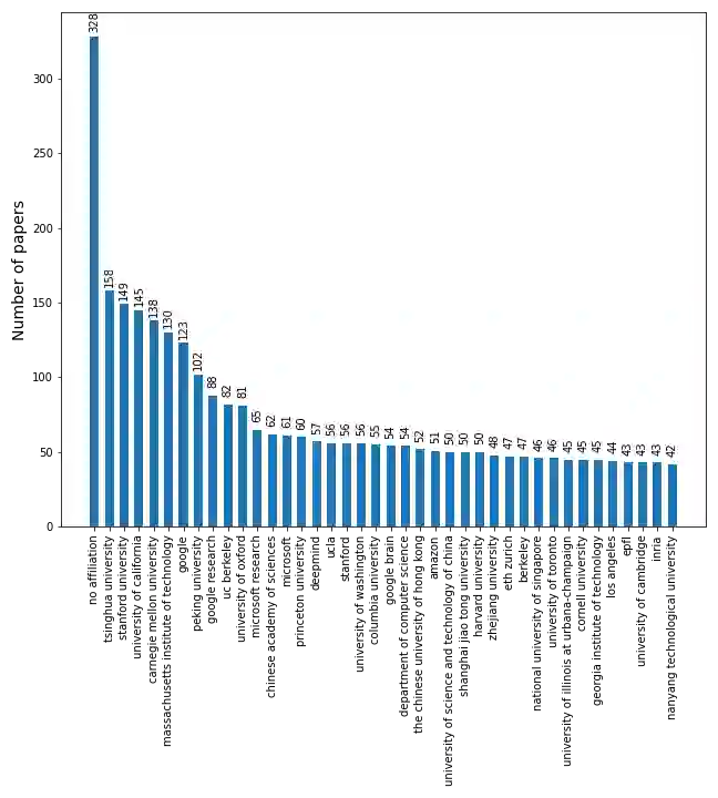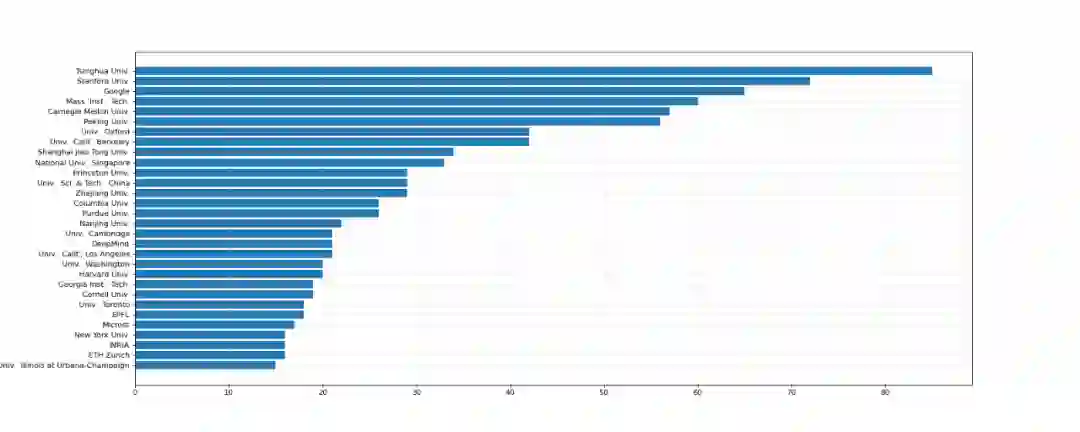 其次是机构中稿量排行,除了无归属机构(no affiliation)之外,排名前三的依次为清华、斯坦福和加州大学。
