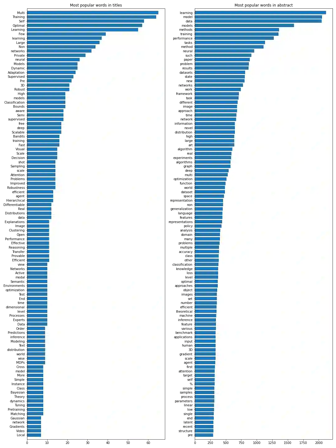 最后,标题中出现词汇最多的前五名依次为 Multi、Training、Self、Optimal 和 Learning,摘要中依次为 learning、model、data、models 和 methods。