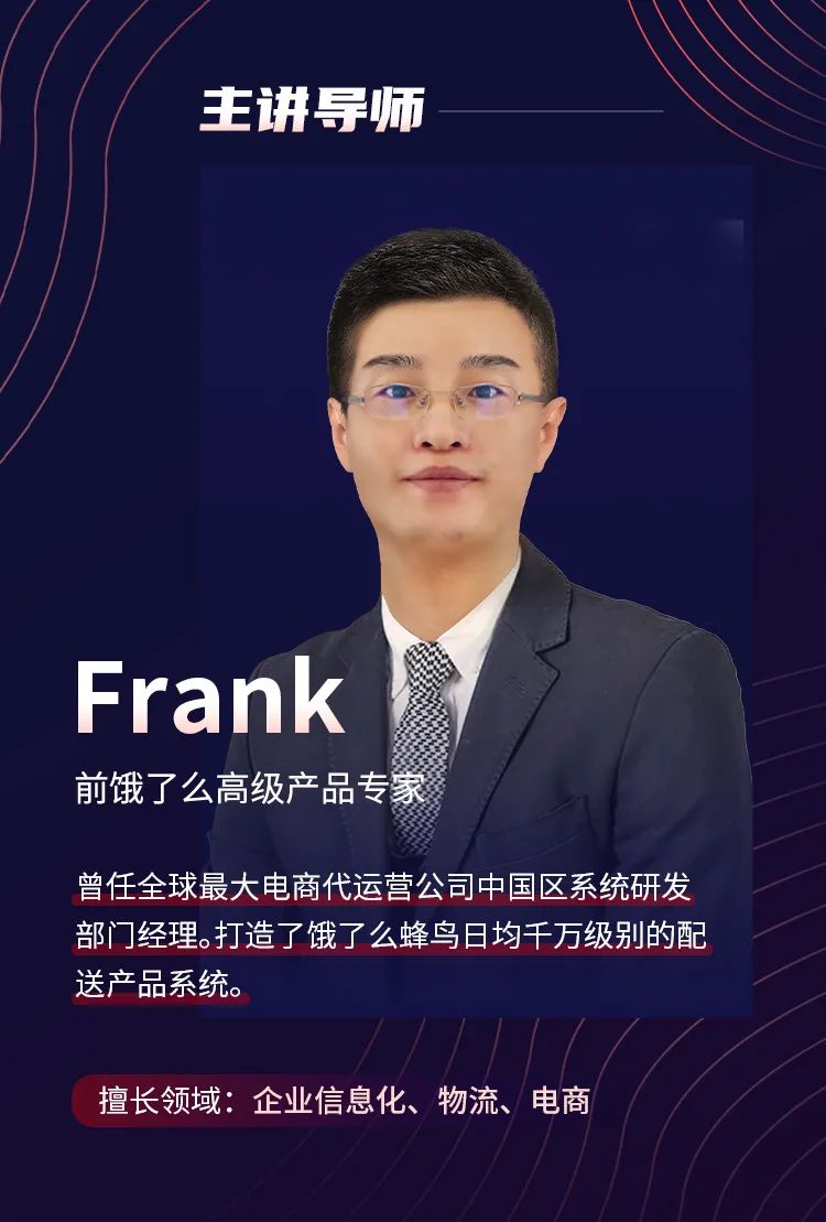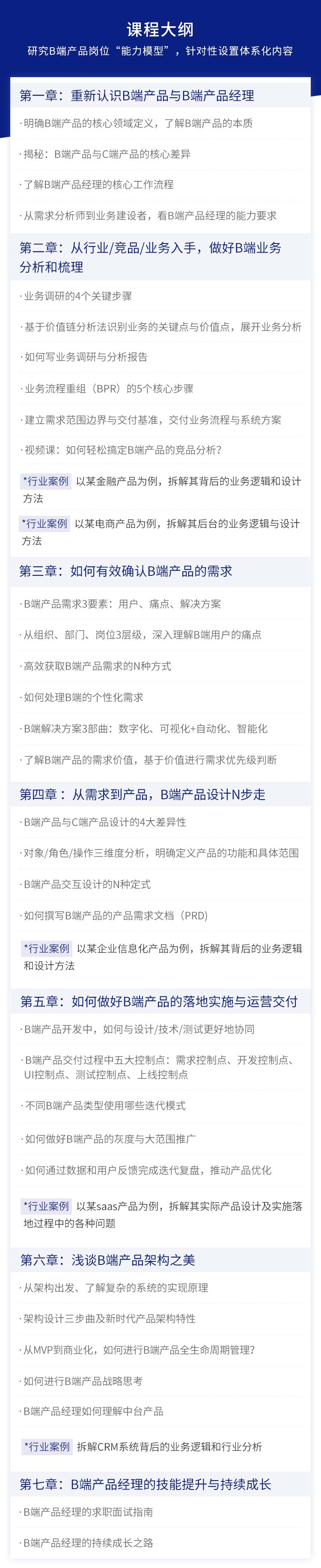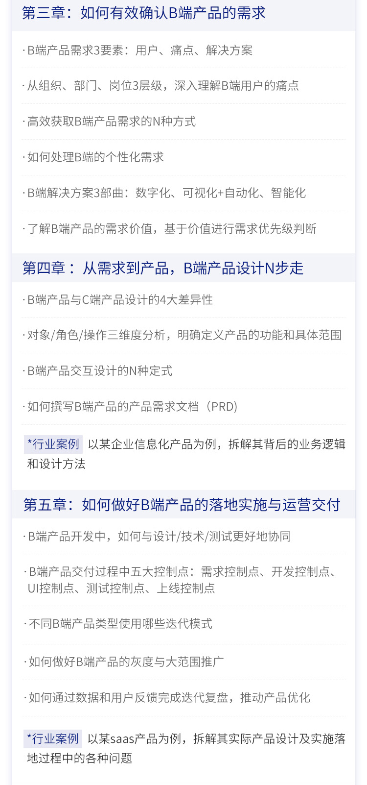 老师将具体从“分析/梳理业务 → 洞察需求 → 产品交互设计 → 开发与实施 → 迭代与运营 → 产品架构设计“等核心内容展开,并通过行业案例拆解细分领域中的B端产品落地。