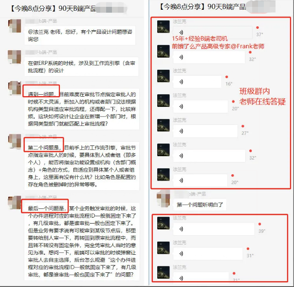 课程的主讲导师,每周会在班级群里给大家专门开小灶,通过语音直播的形式,帮助大家解决在工作中的具体产品/业务问题~