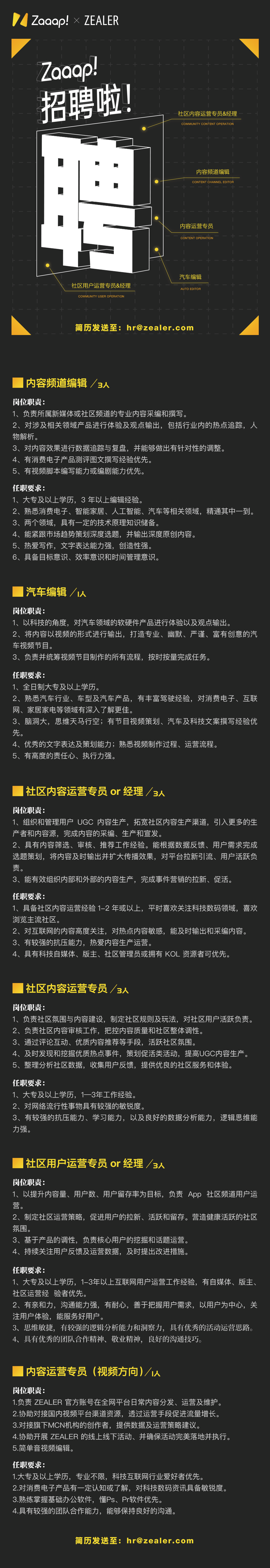 “喜欢ZEALER好多年了,但一直没有合适的岗位”“如果有招运营就好”等等,于是今天我们正式对大家说:如果你喜欢内容创作,那就加入我们吧!