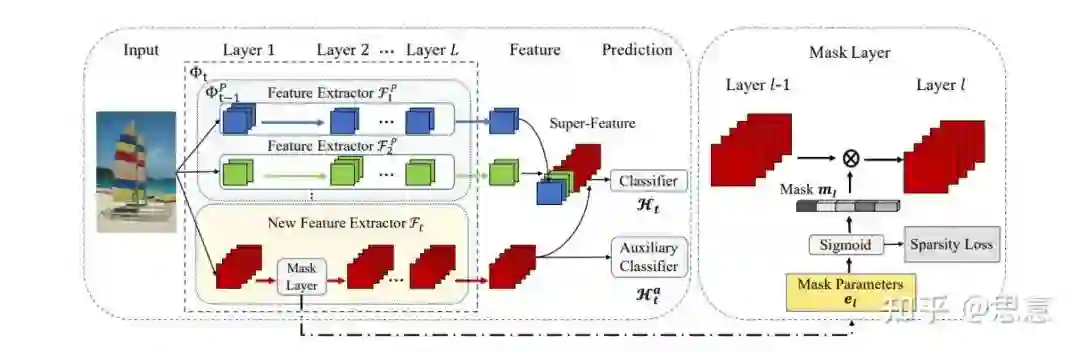 为了更好地提取特征,DER另外使用了一个辅助分类器,仅仅使用新的特征,并要求新的特征空间能够良好的实现新类之间的辨别。而对于所有的旧类样本,辅助分类器会将他们分类到同一个标签上面。