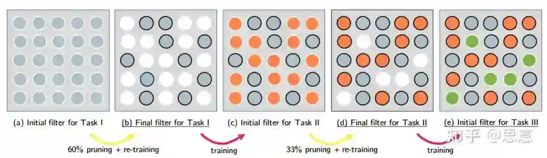 DER还设计了一种剪枝的方式,能够在尽可能保持模型性能的基础上实现大幅度的参数削减。这种剪枝策略从Task-IL的经典方法HAT[11]中借鉴而来,将HAT的以filter的权值的掩码,转变成整个channel的掩码。