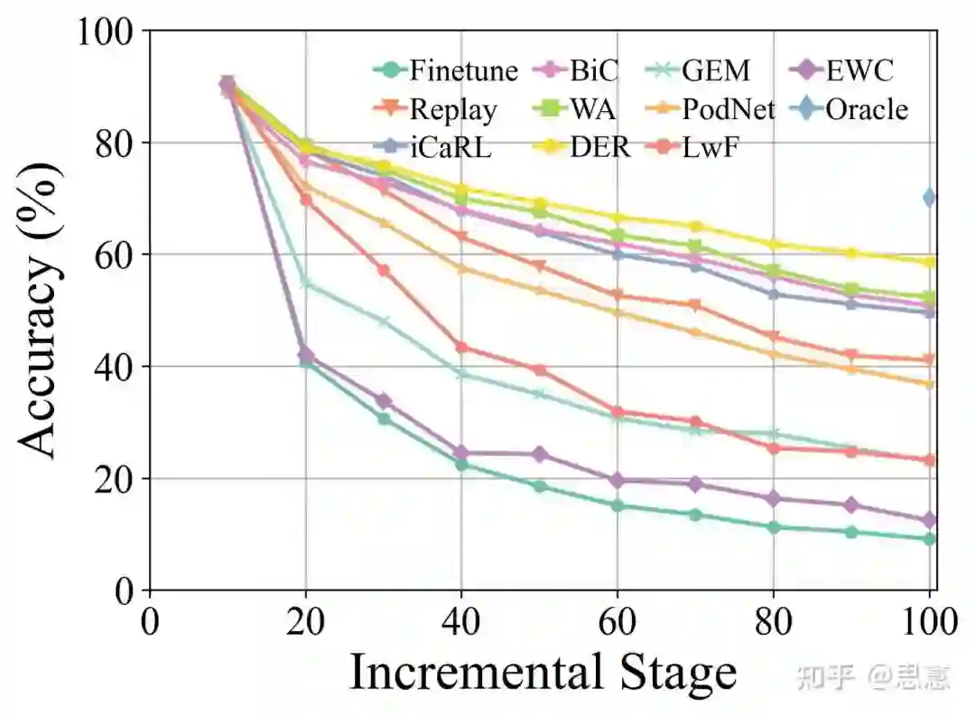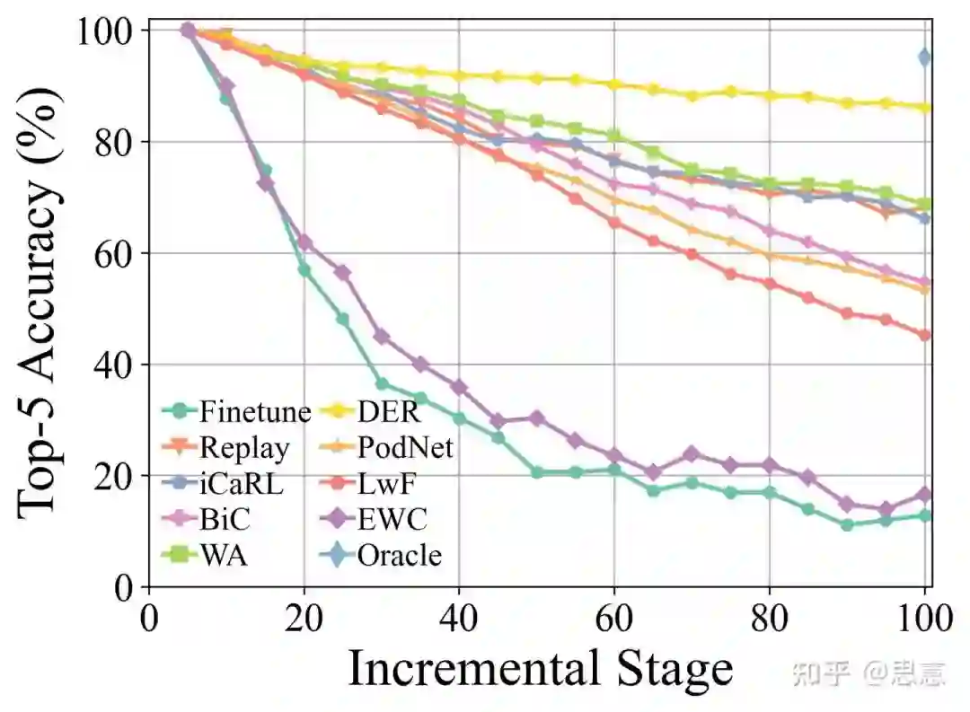 此外,目前还有更为严格地data-IL, 我们在训练时就并不显示的告知task的阶段,希望模型能够适应这种类别不稳定不均衡的数据流。此处我们不展开讨论。