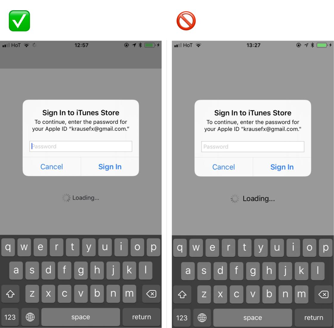 不过,按下 Home 键来辨别其它类型的钓鱼弹窗就不管用了,因为 iOS 上需要 Apple ID 账号和密码的场景很多。比如在 iOS 11 中第三方应用的内购,可能会需要输入密码,而这些窗口在按下 Home 键后是会消失的。