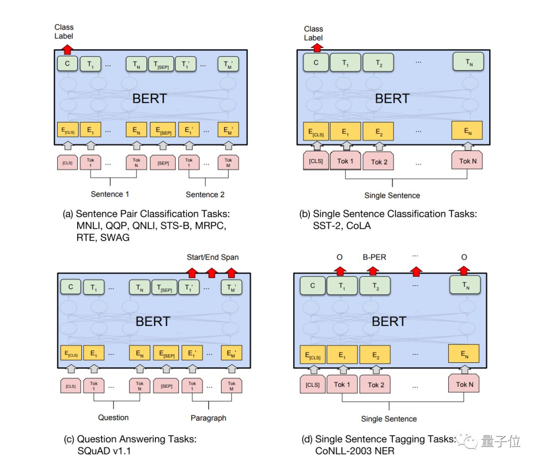 我们的任务特定模型是通过将BERT与一个额外的输出层结合在一起而形成的,因此需要从零开始学习最少数量的参数。在这些任务中,( a )和( b )是序列级任务,而( c )和( d )是token级任务。在图中,E表示输入嵌入,Ti表示token I的语境表征,[ CLS ]是分类输出的特殊符号,[ SEP ]是分离非连续token序列的特殊符号。