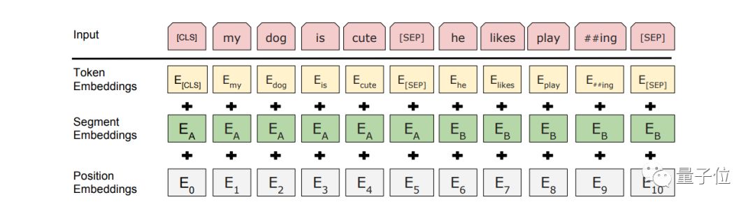 我们的输入表征能够在一个标记序列中清晰地表示单个文本句子或两个文本句子(例如,[问题、答案])。对于给定的token,其输入表征是通过对相应的token、分段和位置嵌入求和来构建的。下图更直观的展示了我们的输入表征。