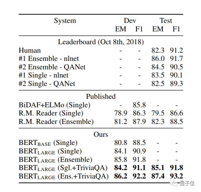 将SQuAD v1.1 问答测试F1提高到93.2分 ( 1.5分的绝对改进),比人类表现高出2.0分。