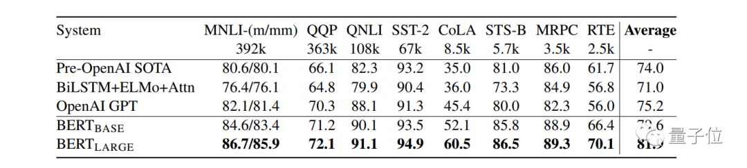 除了SQuAD,BERT还横扫了如下10大NLP测试,包括:GLUE、MNLI、QQP、QNLI、SST-2、CoLA、STS-B、MRPC、RTE、WNLI。