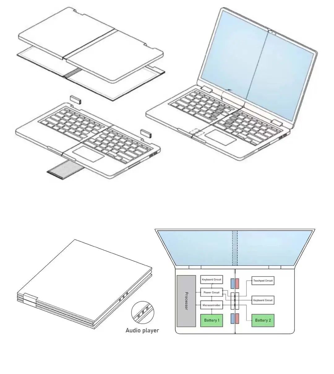 根据世界知识产权局(WIPO)批准并公示的最新技术专利,三星设计了一种“可多次折叠的电子设备”,这款笔记本造型类似传统产品,但是屏幕、键盘中央有一个缝隙,用于折叠。图中看出屏幕中央的缝隙比较明显,预计并没有采用柔性折叠屏,而是将两个独立的屏幕拼接在一起。另一张图片展现了笔记本的内部结构、折叠方式。该产品的键盘可以分离,左右两部分具有独立的电池,采用磁吸方式连接,中央有金属触点。