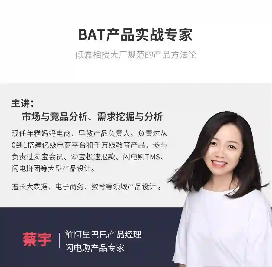 蔡宇老师,前阿里巴巴资深产品经理、闪电购产品专家,擅长大数据、互联网营销、客户关系管理等领域,对市场与竞品分析、需求挖掘与分析有着敏锐的洞察力。