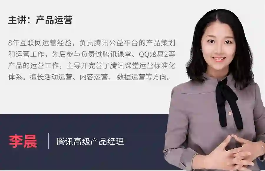 李晨老师,腾讯高级产品经理。先后参加负责腾讯课堂、QQ炫舞2等产品的运营,主导完善了腾讯课堂运营标准化体系,教授给你的产品运营知识,是她一步步亲身实践过的。