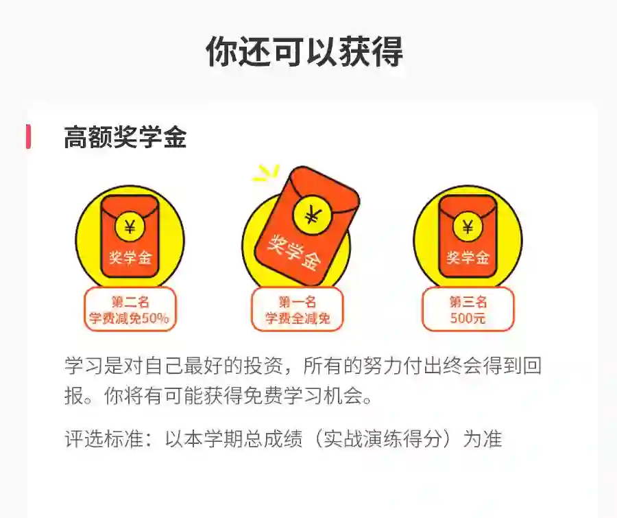 我们更会以本学期总成绩为准,评出前三名颁发奖学金,第三名将获得500元,第二名学费减免50%,第一名学费全减免!学习还能赚学费,这种好事哪里找!