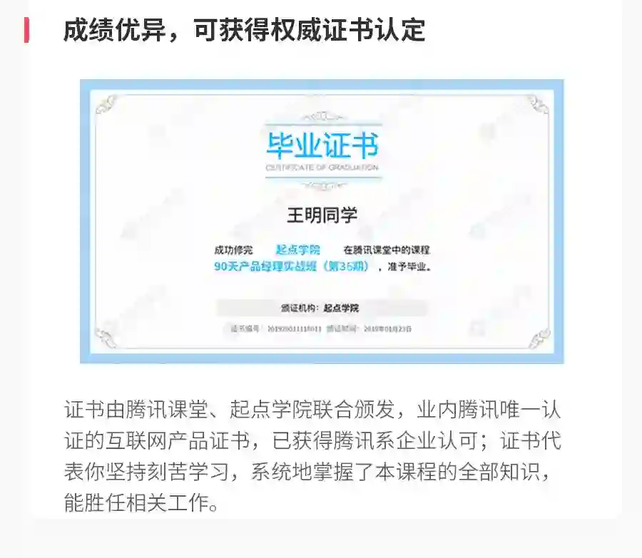 在课程结束时,成绩优异的学员,还将获得权威证书认定,这是业内腾讯唯一认证的互联网产品证书,已获得腾讯系企业认可,含金量满满!