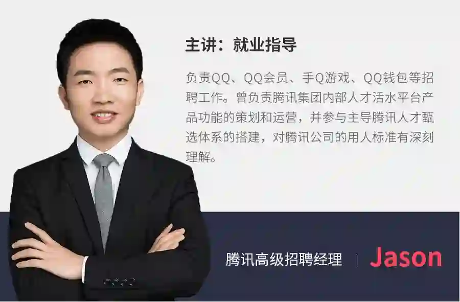 Jason老师,曾参与主导腾讯人才甄选体系的搭建,是腾讯《行为面试法》公司级认证讲师,让你明确自己在产品行业中的能力定位。