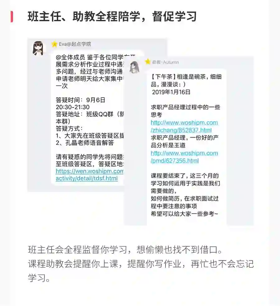 课程中陪你成长的除了导师,还有专属的班主任和助教,他们将全程监督陪学,提醒你上课,也提醒你交作业。