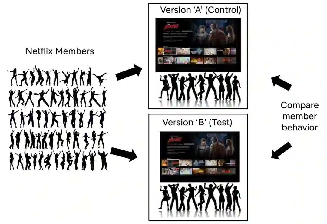 图 4:一个简单的 A/B 测试。我们使用随机分配将奈飞会员的随机样本分成两组。“A”组接受当前的产品体验,而“B”组接受一些改变,这些改变我们认为是对奈飞体验的改进。在这里,“B”组接受“倒置”的产品体验。然后,我们比较两组之间的指标。关键的是,随机分配确保了平均而言,两组之间的所有其他内容都保持不变。