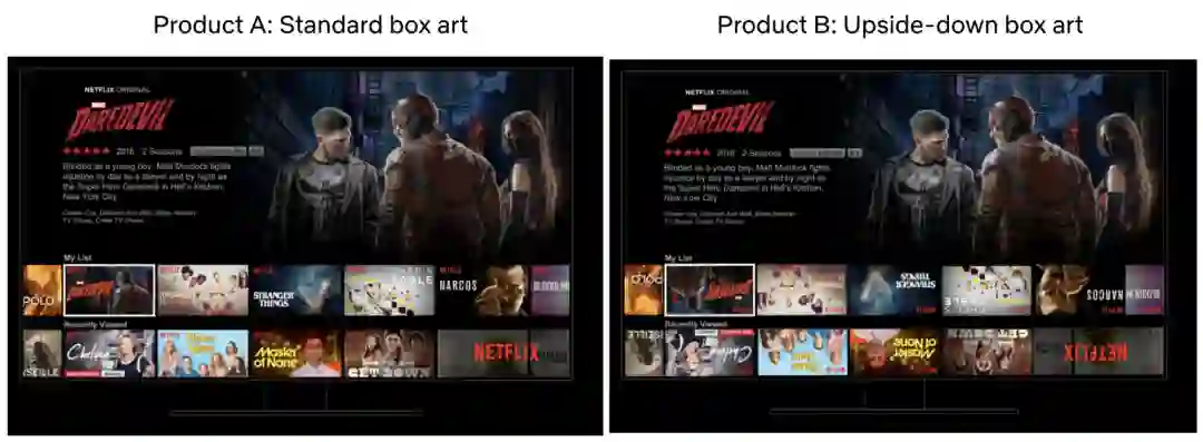 A/B 测试是一种简单的对照实验。比如说(这是一个假设!),我们想了解在电视用户界面中倒置所有盒子展位(boxart)的新产品体验是否对我们的会员有益。