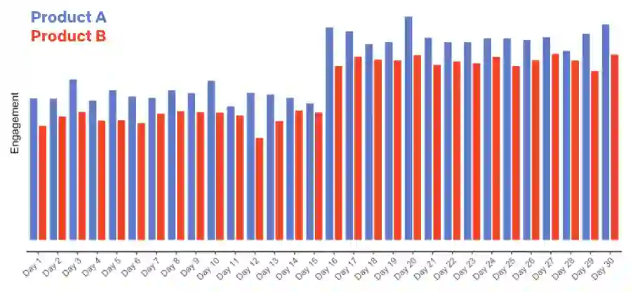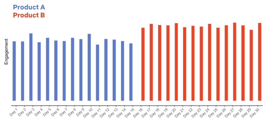 A/B 测试让我们做出了原因陈述。我们只在 B 组中引入了倒置的产品体验,并且由于我们将会员随机分配到了 A 组和 B 组,所以这两组之间的其他一切都保持不变。因此,我们可以很可能地得出结论(更多细节将在下次讨论),即倒置的产品导致了用户粘性的下降。