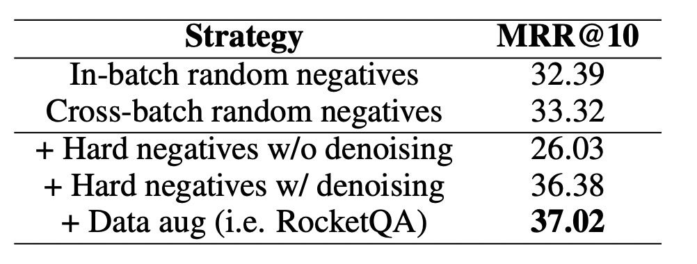 表 1 MSMARCO 数据集中,去噪的强负例采样与数据增强策略对模型效果的影响