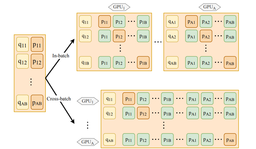 图 3 批次内负采样(上)和跨批次负采样(下)的对比