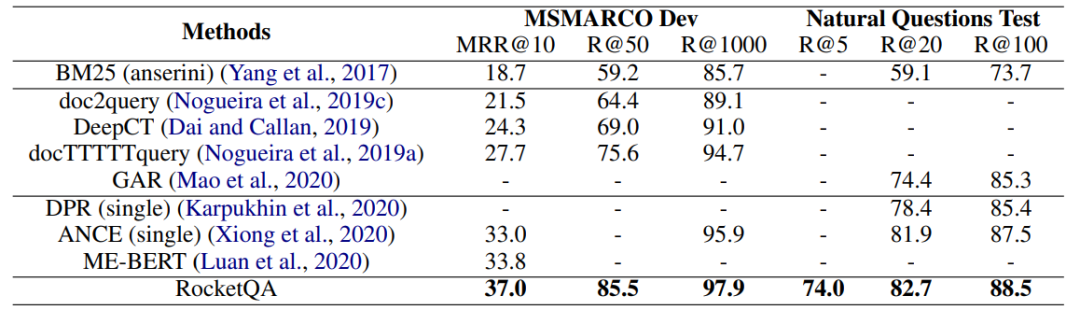表 2 RocketQA 在微软 MSMARCO 和谷歌 Natural Questions 数据集上段落检索的效果