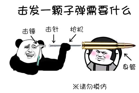 枪弹由弹头、弹壳、底火和发射药组成。底火用来点燃发射药,里面装有对冲击极为敏感的起爆药,于是它和人一样,受到打击就会发火。火焰通过导火孔点燃发射药,点燃的瞬间产生大量高温气体,推动弹头向前。国内生产的制式枪炮发射药通常是硝化棉,经溶剂塑化成颗粒状,性能稳定。