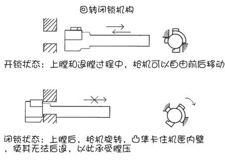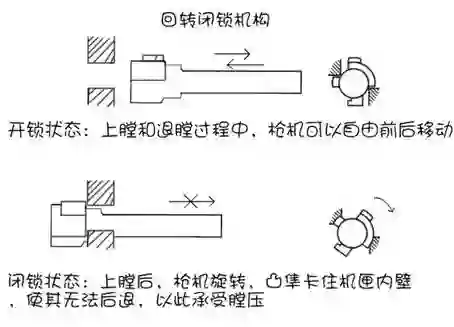 这个机构要求一会能后移一会又不能后移,于是我们在枪机上嵌套了一个枪机框:上膛时其实是枪机框前后移动带动枪机,枪机框上有一个斜槽,和枪机上的凸榫配合,枪机到达末端位置不能继续移动时,枪机框还可以移动,于是凸榫沿着斜槽侧滑,使枪机回转,卡住机匣实现闭锁;枪机框后退的时候,又使枪机反向回转实现开锁。它就像水龙头,拧上就关了,反着拧又开了。