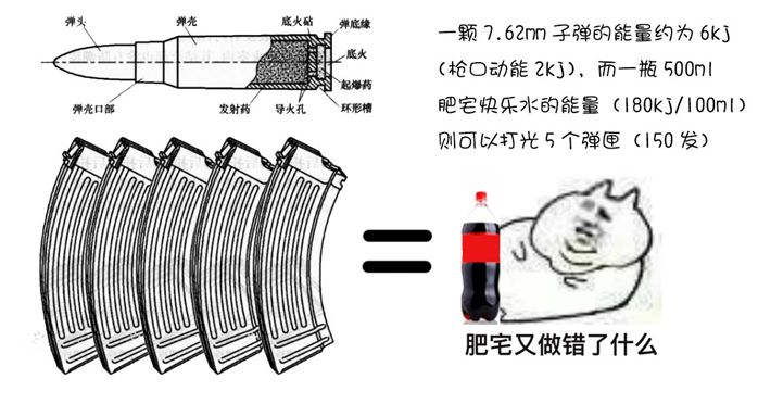 AK47所使用的7.62mm步枪弹燃烧时间仅0.0013s,同时释放6kJ热量和1.44L气体,弹头初速度超过700m/s。弹头出膛后穿过身管,多数现代枪械为线膛枪,内部有螺旋状凹槽,可以使弹头旋转射出,从而提高飞行的稳定性。