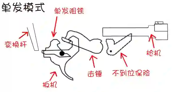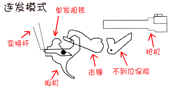 连发模式下,变换杆卡住单发阻铁,不让它移动,击锤回弹后又立刻开始下一次击发,直到松开扳机,阻铁才后移卡住击锤。
