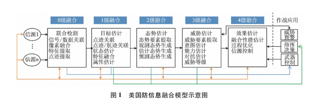 2) 基于数据驱动认知。综合融合当前观测的 多元态势数据,结合先验知识数据,识别战场实体的 属性和关系,预测对手的作战企图,评估其威胁影响 范围,生成多粒度态势。